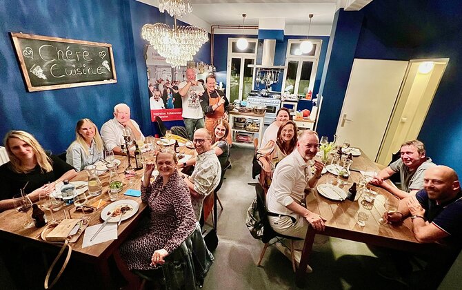 Der Abend startet mit einer lockeren Q&A-Runde, in der die Mitgliedsunternehmen ihre Fragen loswerden können. Danach geht’s los: Gemeinsam mit der oder dem Chef de Cuisine schnippelt, kocht und brutzelt ihr in der Küche. Während des gemeinsamen Kochens und Essens bleibt viel Zeit für spannende Gespräche und Networking. So wird nicht nur zusammen gekocht, sondern auch diskutiert und gelacht - oft bis spät in die Nacht.
